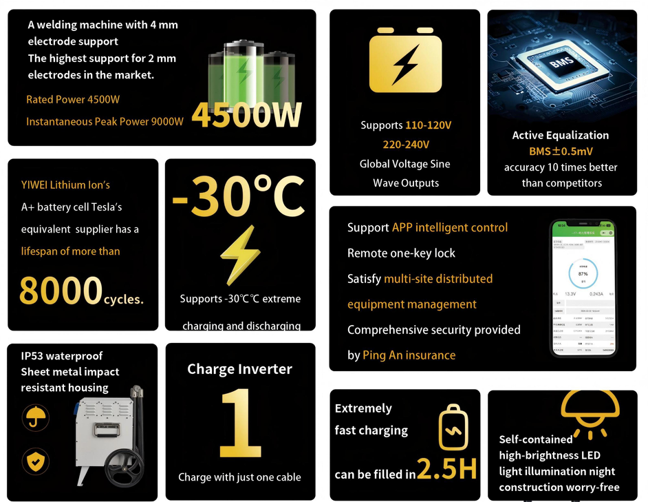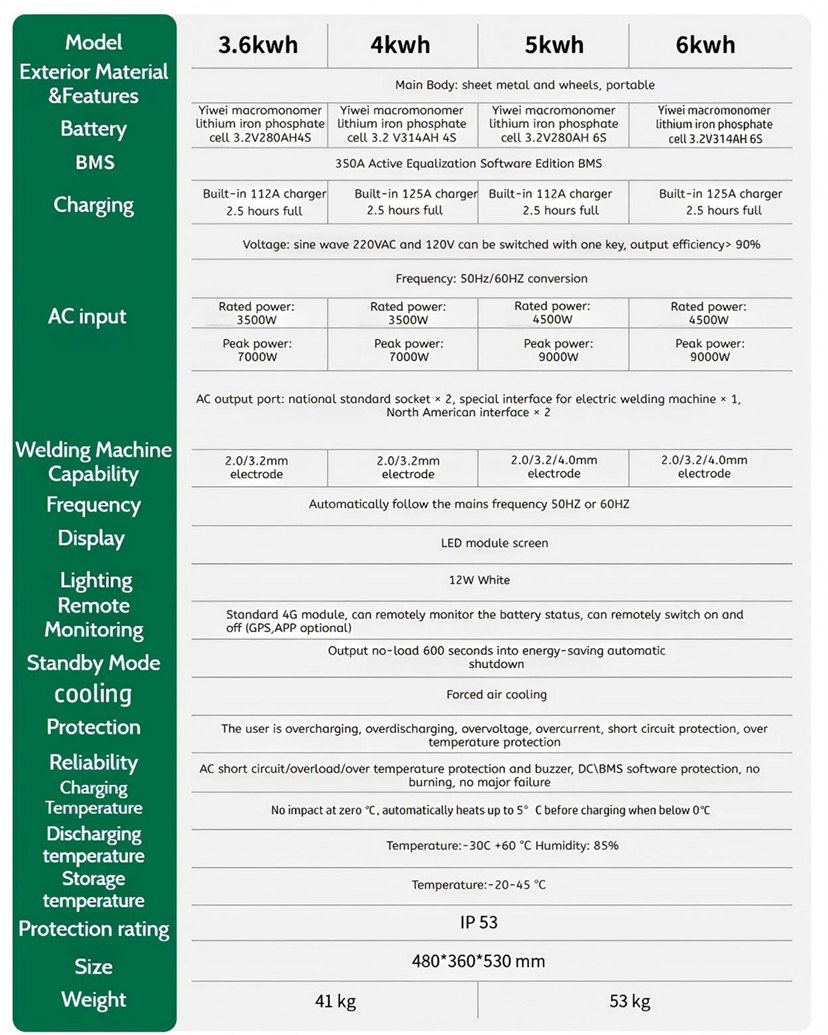 This series of products adopts integrated design, battery system,inverter and control unit are highly integrated,compact structure, plug and play, suitable for emergencypower supply, outdoor work, vehicle carrying and other scenarios.lt provides a variety of capacity options from3.6kWh to 6kWh, taking into account lightness and practicality, and meeting the mobile power supply needs of medium and high power equipment.